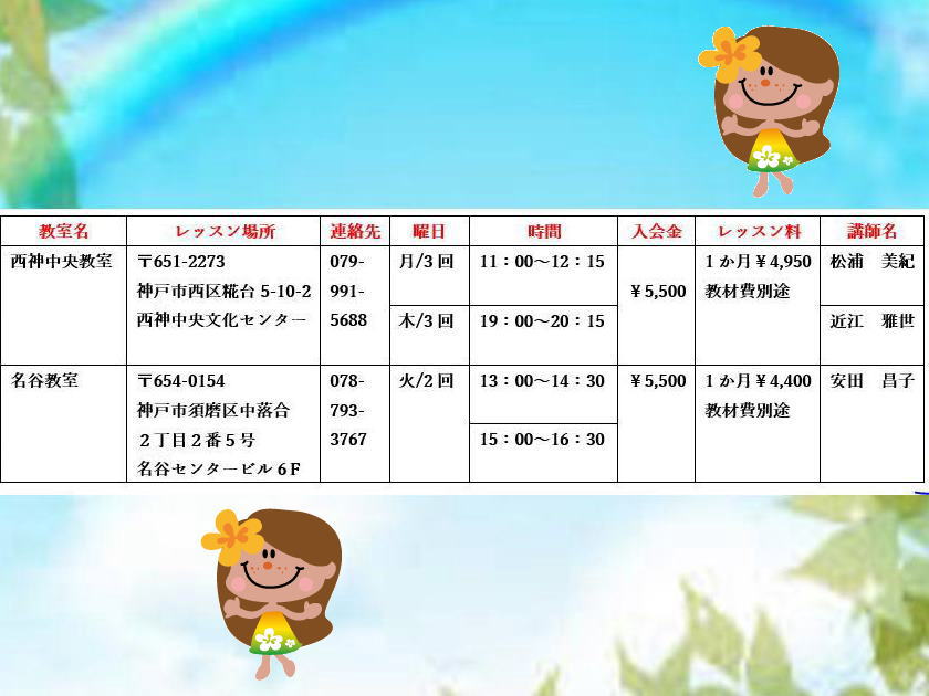 TOP お知らせ 西神中央教室・名谷教室開校 スタジオクラス ステップアップクラス 一般クラス 楽器クラス・カヒコクラス・集中ステップクラス カルチャーレッスン リビングカルチャー・お勤め帰りのフラ こどもフラ・親子フラ スケジュール 西神中央教室・名谷教室開校 2020年02月13日 新設です!『体験レッスン』の連絡お待ちしています « 始まりました! ベビーハグフラお知らせ一覧へ お知らせ ハーバーランド・エッグスンシングスでの演奏 »