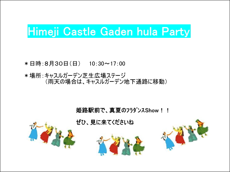 TOP お知らせ 8月30日 Himeji Castle Garden Hula スタジオクラス ステップアップクラス 一般クラス 楽器クラス・カヒコクラス・集中ステップクラス カルチャーレッスン リビングカルチャー・お勤め帰りのフラ こどもフラ・親子フラ スケジュール 8月30日 Himeji Castle Garden Hula 2015年07月17日 姫路駅前で真夏のフラダンス・・・ 詳細は後日、記載します « 8月29日 おおべのショーお知らせ一覧へ 8月29日 SUMMER FESUTA »